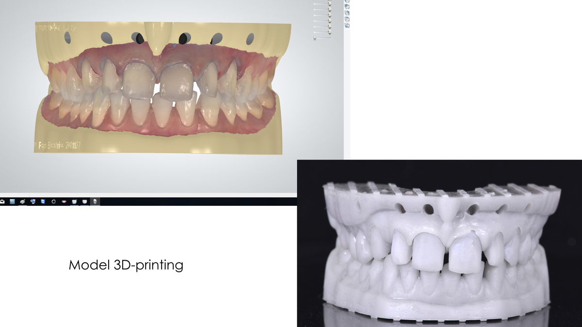 Fig. 11. Progettazione di un modello digitale con elementi carotati sfilabili e sua realizzazione con stampante 3D DWS XFAB 2500 e resina Invicta 917 (DWS, Thiene, Italia), che servirà a consentire la stratificazione delle masse ceramiche.