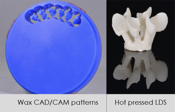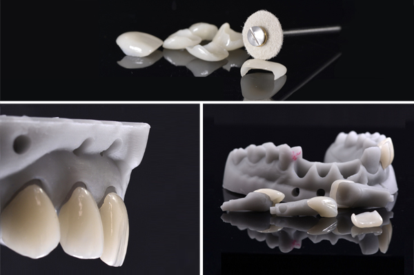 Fig. 12,13. I restauri vengono fresati CAD CAM da un disco di cera calcinabile, già collegati ai canali di colata per il posizionamento sulla basetta di pressatura. I modellati in cera vengono in seguito sottoposti a presso-fusione, selezionando pellet ad alto valore e traslucenza (e-Max Press, Value 2, Ivoclar Vivadent, Schaan, Liechtenstein). Le veneers vengono infine stratificate con ceramica eMax Ceram (Ivoclar Vivadent, Schaan, Liechtenstein) e finalizzate con trattamenti meccanici di superficie, con feltrini imbibiti di pasta diamantata (Renfert Dia-Finish, Renfert, Hilzingen, Germany), per ottenere la brillantezza desiderata.