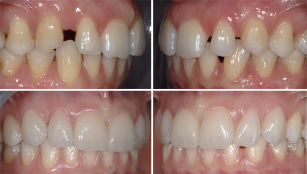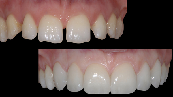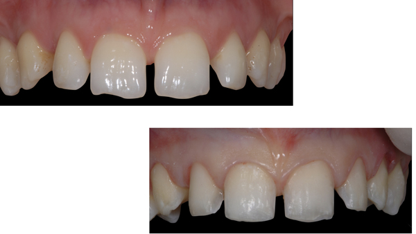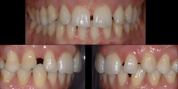Fig. 1. Situazione intraorale iniziale. La presenza di diastemi importanti e di evidenti disarmonie morfologiche coronali ha spinto questa giovane ragazza a rivolgersi allo specialista per migliorare il suo sorriso, richiedendo espressamente una terapia che non fosse eccessivamente prolungata o aggressiva. Alla paziente è stato inizialmente spiegato che, per un risultato ottimale, sarebbe stata necessaria la correzione preliminare della posizione dei denti attraverso un’adeguata terapia ortodontica, magari con allineatori, minimizzando così l’intervento restaurativo sugli elementi dentari. Dopo lunghe discussioni, la paziente ha ribadito di non essere disponibile ad affrontare terapie prolungate ed ulteriormente dispendiose, con la consapevolezza di approdare ad una soluzione di compromesso.