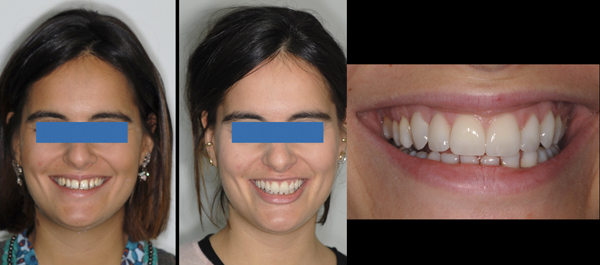 Fig. 14, 15 e 16. I restauri sono stati infine cementati adesivamente (Panavia V5 - Kuraray Noritake, Tokio, Japan). Le immagini mostrano una nuova armonia del sorriso più che accettabile, nonostante fosse stata fin dall’inizio rifiutata dalla paziente la terapia ortodontica preliminare.