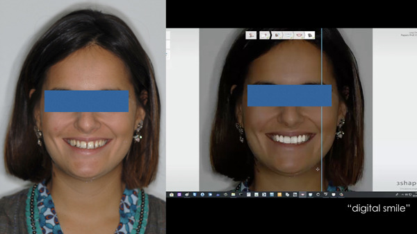 Fig. 2. Prima di qualunque intervento, è stata realizzata alla poltrona una rapida previsualizzazione del possibile risultato estetico, utilizzando il software Dental Desktop Smile Design (3Shape, Copenhagen, Denmark), grazie alla quale sono stati evidenziati nuovi volumi, forme, disposizioni e simmetrie dentali, facendo notare alla paziente che, in assenza di ortodonzia, la linea mediana inferiore sarebbe comunque rimasta fuori centro.