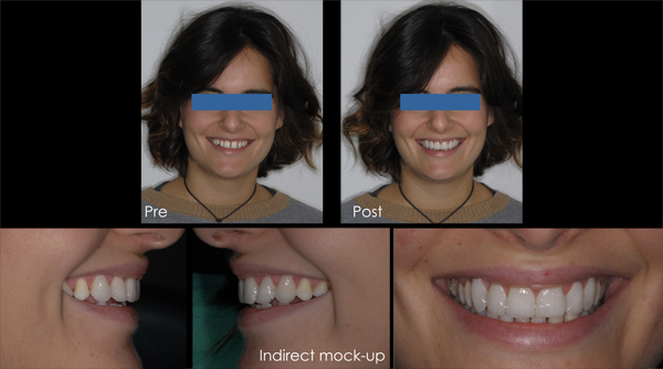 Fig. 3. In seguito, attenendosi alle morfologie proposte nel “digital smile”, è stato effettuato un “mock-up” intraorale indiretto, con sei elementi in PMMA fresato fresatore DWX-50 (DGSHAPE a Roland Company, Hamamatsu, Giappone) uniti tra loro, da utilizzare in seguito come restauri provvisori, ottenendo dalla paziente un entusiastico consenso.