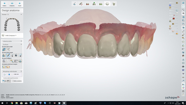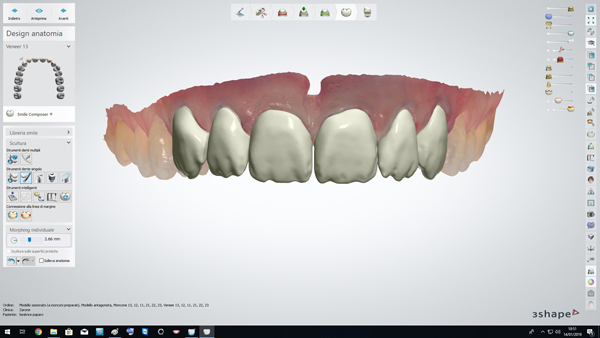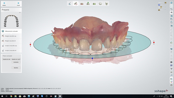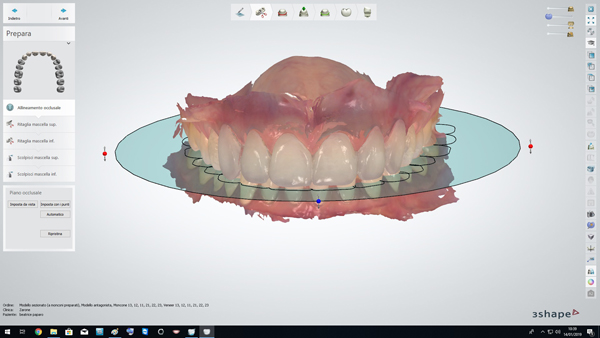 Fig. 5. Al termine delle preparazioni sono state realizzate le scansioni intraorali delle arcate dentarie di cui in figura si evidenzia l’allineamento del piano occlusale in ambiente CAD (Dental System Premium 3Shape, Copenhagen, Denmark). Data la cospicua modifica di forme e volumi, si è optato per disilicato di litio, stratificato, preferendolo alla ceramica feldspatica in virtù della maggiore resistenza alla flessione.