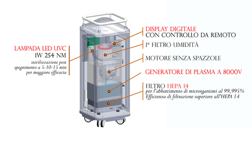 La combinazione di HEPA14, Generatore di plasma a 8000 V e lampada led ad ultravioletti garantisce il più alto livello di sterilizzazione nel minor tempo possibile