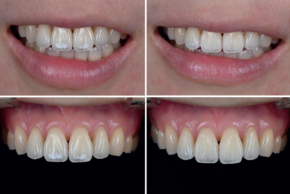 Le lesioni sono state nuovamente mordenzate e asciugate. Questo passaggio è stato ripetuto per tre volte su 21 e quattro volte su 11. Dopo aver valutato la scomparsa della lesione è stata eseguita infiltrazione con Icon-infiltrant per 3 minuti, asciugatura con aria, passaggio di filo interdentale e quindi fotopolimerizzazione per 40 secondi. Viene quindi effettuata una seconda applicazione di infiltrante per 1 minuto e successiva fotopolimerizzazione per 40 secondi. Prima di rimuovere la diga viene fatto vedere al paziente il risultato ottenuto. Viene effettuata valutazione fotografica del risultato finale.