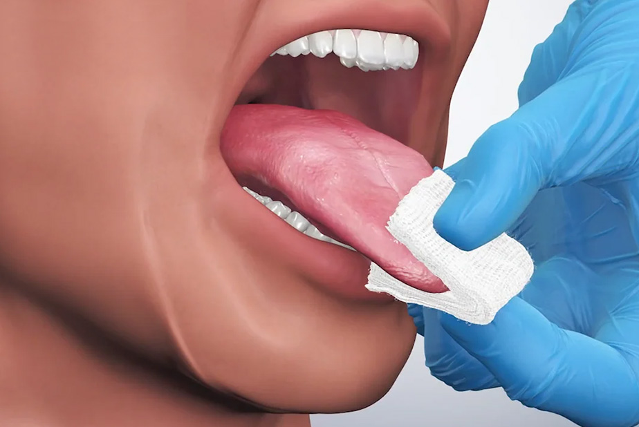 - Sollevare la lingua ed esaminare la superficie ventrale e il pavimento della bocca.