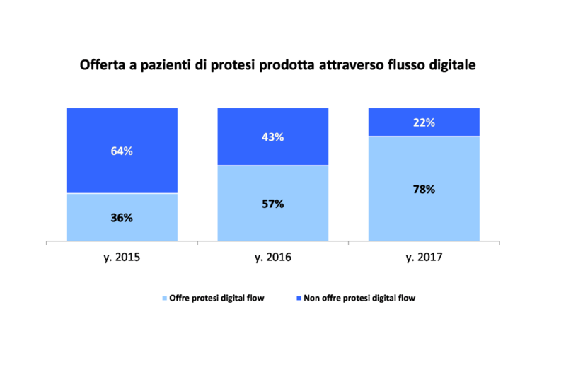 In Italia, le protesi provenienti da flusso digitale, riguardano oltre la metà dei manufatti protesici realizzati da laboratori dotati di fresatori o dai centri di fresaggio. Per quanto concerne gli studi dentistici, circa l’80% propone ai pazienti protesi provenienti da flusso digitale: una percentuale che era del 57% nel 2016 e del 36% nel 2015 (fonte dati: Roberto Rosso, Keystone). Al momento, la percentuale di studi dentistici che possiede uno scanner intraorale è del 9% circa, quindi gran parte dei manufatti protesici viene realizzata in digitale, per quanto riguarda il laboratorio, ma sulla base di impronte tradizionali. Le previsioni, però, indicano un forte incremento della tecnologia CAD-CAM anche all’interno dello studio odontoiatrico nei prossimi due anni (fonte dati: Roberto Rosso, Keystone).