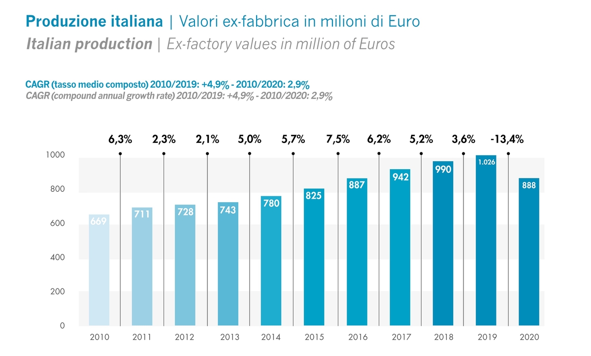 Come si può osservare nel grafico, lo sviluppo della produzione italiana fino al 2019 presentava una crescita media annua composta intorno al +5% all’anno (CAGR), tale indicatore (oggi ridottisi estemporaneamente al +2,9%) dovrà essere riconsiderato nel 2021, al netto dell’impatto congiunturale della pandemia.
