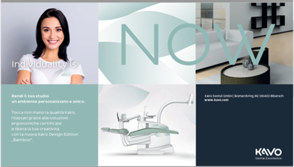 Scoprendo la nuova Design Edition, si intuisce che non si tratta solo di una versione colorata del classico riunito, bensì di un approccio integrato alla creazione di un interior design personalizzato che può essere sviluppato dalla sala di attesa alla sala di trattamento rendendo lo studio un ambiente elegante, coerente e curato anche nei minimi dettagli. Come? Con creatività e con uno dei tre temi che KaVo mette a disposizione nei più comuni formati grafici così che possano diventare l’ispirazione per biglietti da visita, carte da parati, cuscini per la sala d'attesa, uniformi e tanto altro.