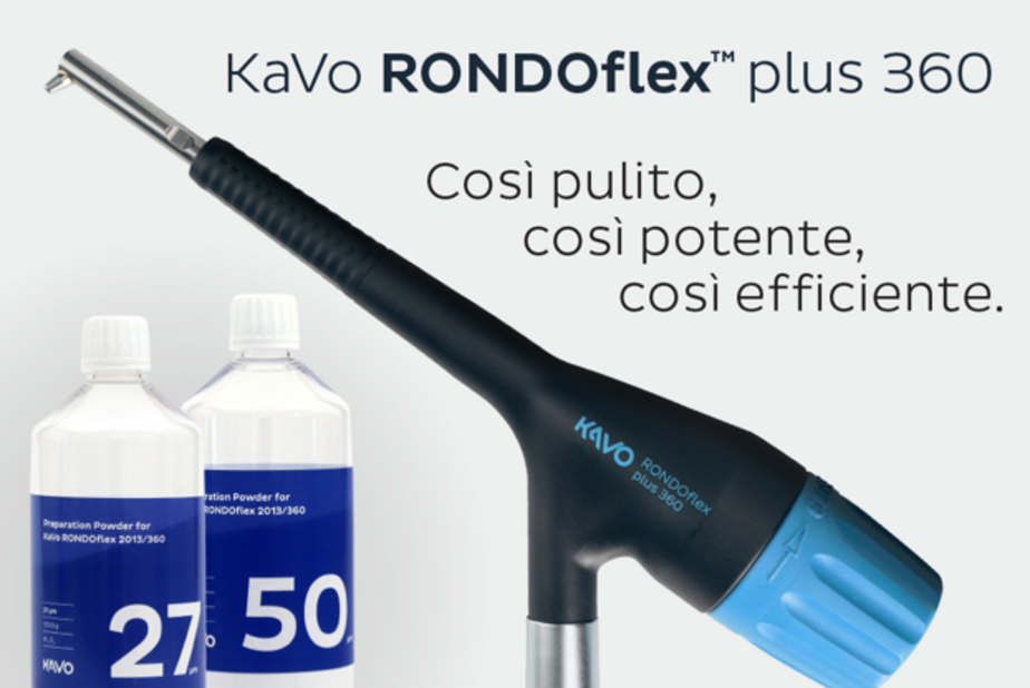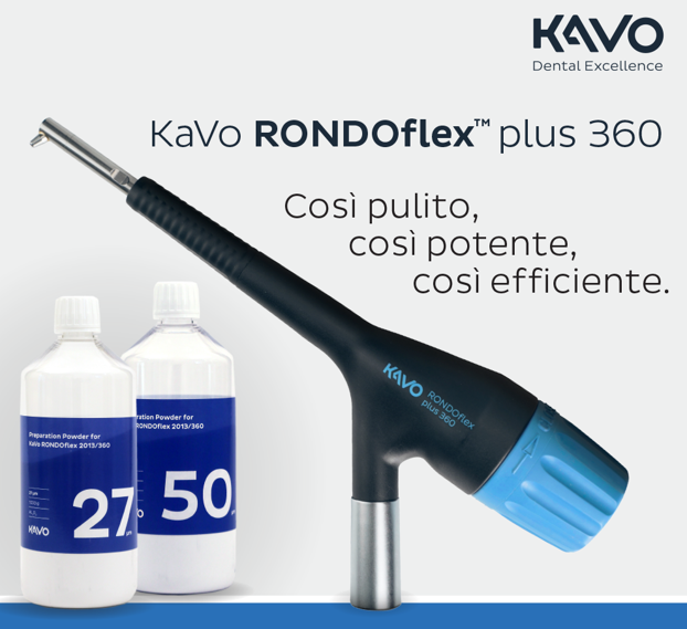 RONDOflex™ 360 Plus è preciso e pulito anche sulle superfici da trattare: le preparazioni risultano rifinite e ampliate offrendo una buona base per la tecnica adesiva prescelta. Grazie a queste proprietà, è possibile utilizzare RONDOflex™ 360 Plus in qualsiasi studio odontoiatrico. Un metodo potente, ma delicato basato sull’effetto dell’energia cinetica acquisita dalle particelle di polvere della granulometria prescelta (27 μM o 50 μM) che vengono accelerate sino a 20 m/sec. I vantaggi di RONDOflex plus sono svariati: uno strumento leggero, preciso, che offre la migliore protezione possibile dello smalto sano e che permette di effettuare tecniche minimamente invasive, delicate e senza fresatura, rumore e vibrazioni sgraditi ai pazienti più sensibili, come bambini e adolescenti. KaVo RONDOflex ™ 360 Plus definisce gli standard nella tecnologia abrasiva offrendo all’odontoiatra efficienza, facilità d'uso e numerose applicazioni tra cui la pulizia superficiale o profonda dello smalto e dei materiali protesici, la preparazione di carie per piccole ricostruzioni in composito di Classe da I a VI, l’apertura di solchi, fessure e lesioni incipienti, la rimozione di ricostruzioni in composito, discromie o tatuaggi da amalgama, la rimozione di compositi e altri materiali di riempimento a base di resina, la pulizia e la mordenzatura meccanica delle superfici di metalli, compositi, acrilici, ceramiche e amalgame per una migliore adesione. RONDOflex è indicato anche per il trattamento della superficie dentale previo all'applicazione di brackets ortodontici, faccette o manufatti protesici come ponti, corone e intarsi.