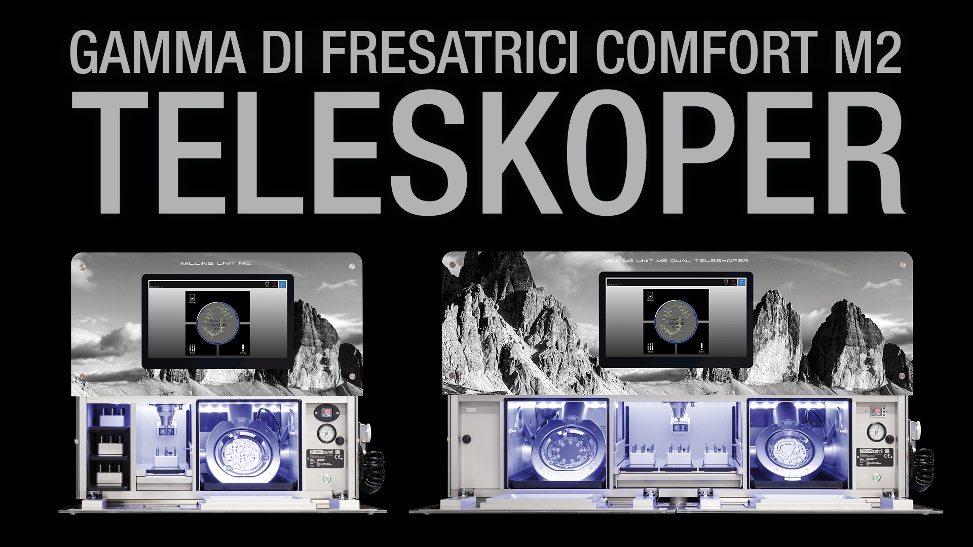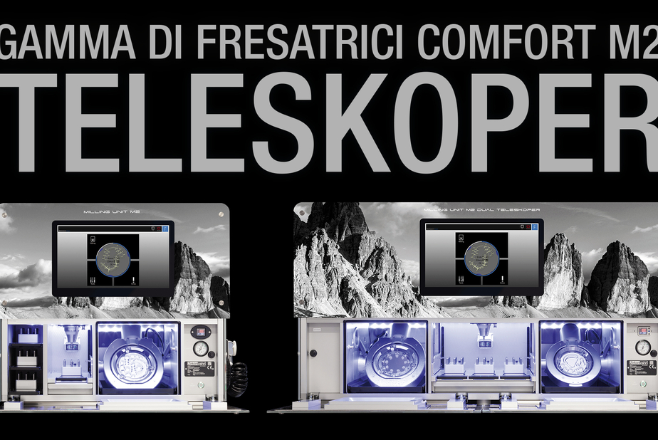 La nuova linea di fresatrici comfort M2 è sinonimo di comfort operativo avanzato e versatilità. La linea comprende cinque fresatrici – M2 Wet Heavy Metal, M2 Teleskoper, M2 Dual Wet Heavy Metal, M2 Dual Teleskoper e M2 Dual Double Teleskoper caratterizzate da una tecnologia di fresatura simultanea a 5+1 assi completamente automatica. Il pezzo forte in termini di flessibilità è l’extra-large Teleskoper Orbit di ⌀ 125 mm (già integrata di default nelle versioni Teleskoper della linea M2) che, in combinazione con diversi supporti speciali, consente di lavorare tutti i più comuni materiali dentali teneri e duri dal diametro di 95 mm, 98 mm, 106 mm e persino 125 mm. I blocchi possono essere rimossi dall'orbita e reinseriti nella stessa posizione con una precisione dell’ordine del micron. Questo procedimento è particolarmente utile per regolare la frizione nelle strutture telescopiche o per produrre in due step i prototipi a carico immediato per restauri supportati da impianti (tecnica del Double Milling).