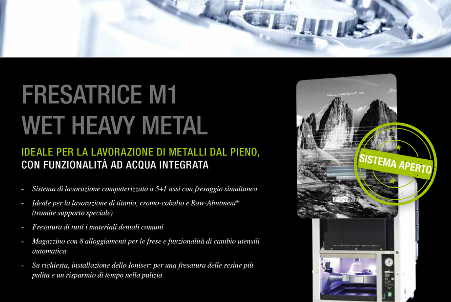 La fresatrice M1 Wet Heavy Metal di Zirkonzahn nasce con una missione specifica: garantire une fresatura dei materiali duri altamente precisa. In particolare, si distingue per le sue dimensioni molto ridotte (48 x 69 x 63 cm) e per la funzionalità di lavorazione ad acqua integrata. Grazie a questa funzione, oltre ai comuni materiali teneri la macchina può lavorare con precisione anche i metalli duri. La fresatrice M1 Wet Heavy Metal presenta un’elevata stabilità durante la fresatura dei metalli grazie all’orbita alloggiata su quattro cuscinetti e al mandrino high-torque.