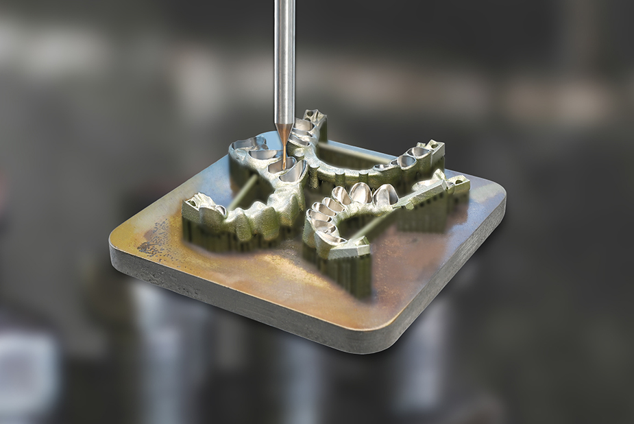 Allora perché non combinare il meglio di queste due principali tecniche di produzione per ottenere protesi dentali dalle forme dinamiche ed anatomiche ma allo stesso tempo estremamente precise nelle aree necessarie? La soluzione è la produzione IBRIDA con ripresa del LaserMelting. Dopo accurati test e approfondite analisi, CADdent è riuscita a sviluppare una tecnologia adatta a strutture in cobalto-cromo e titanio. Nella produzione IBRIDA si costruisce prima il componente mediante LaserMelting. Successivamente, si esegue la post-elaborazione con le nostre fresatrici CNC ad alta precisione nei punti rilevanti per l'accoppiamento. Questo garantisce un ottimo adattamento e una qualità superficiale altamente funzionale delle aree post-fresate. Inoltre, le superfici LaserMelting più ruvide delle aree non fresate sono ideali per il rivestimento in polimero.