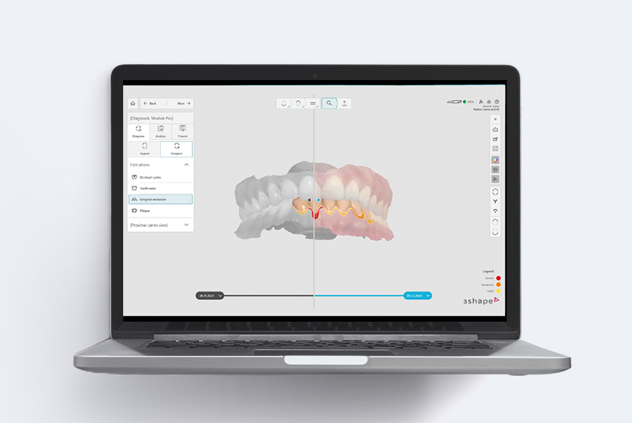 Esclusivamente compatibile con TRIOS 6, TRIOS Dx Plus rileva in materia automatica su ogni scansione: carie superficiali, carie interprossimali, residui di placca batterica, abrasioni, usura dentale e recessioni gengivali. Ultimata la scansione, con un solo click sarà possibile accedere alle funzionalità diagnostiche, misurare le patologie e confrontare il loro sviluppo rispetto alle scansioni acquisite in precedenza. Inoltre, è possibile ottenere in automatico un report dello stato di salute dei vostri pazienti, per poter discutere insieme a loro e mantenere alta la loro motivazione.